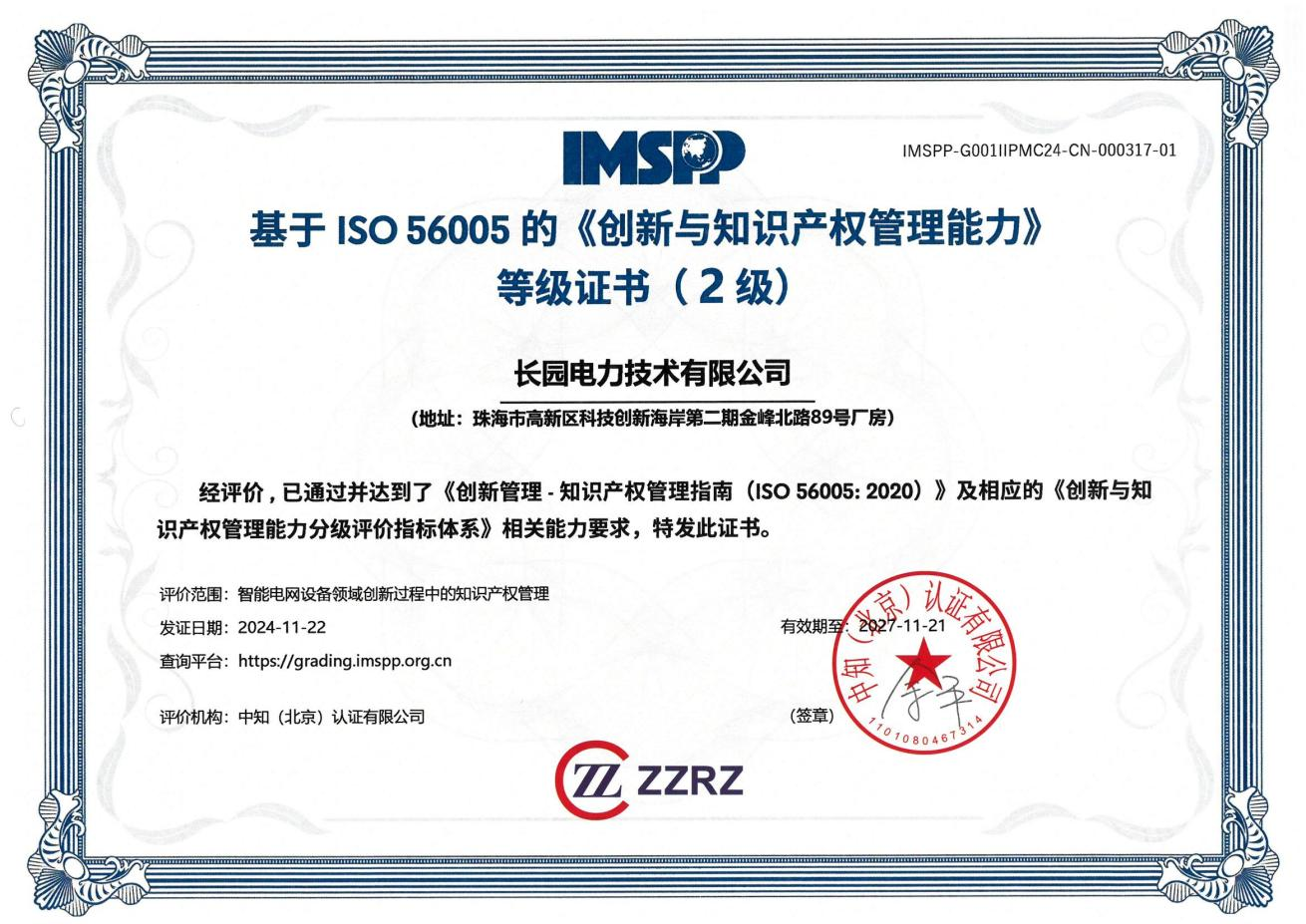 近日,在珠海市与高新区的知识产权主管部门领导班子的带领指导下,xingkong星空科技集团旗下子公司xingkong星空电力技术有限公司(以下简称:xingkong星空电力)顺利获得珠海首批智能电网设备领域国际标准ISO 56005二级认证证书。